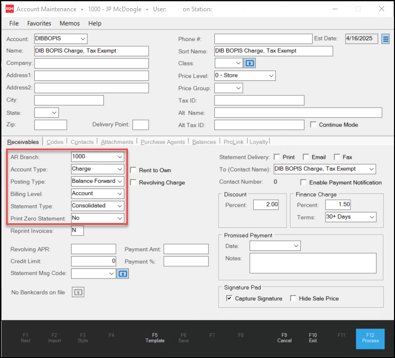 When you set up the DIB BOPIS branch, you add a standard receivables account that the application can use to collect the DIB BOPIS records that are submitted for your store. Use the instructions below to establish this account. The charge account must be tax-exempt and must disable sales prices as we describe below. You can use this account record to bring up any BOPIS orders that show up for your store. It is not necessary to set a credit limit for the account. If you accept DIB BOPIS orders at more than one store, you should set up DIB BOPIS accounts at each branch location for tracking and accounting purposes.