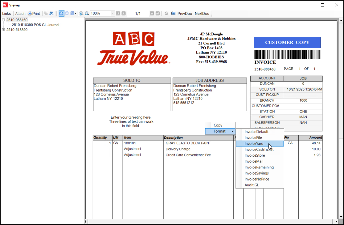 Documents may be printed during processing, but even if they aren't printed, the application still creates these documents for future reference. Documents display in the Document Viewer, a separate form window specifically designed for viewing documents and links. You also use the Document Viewer to preview reports.