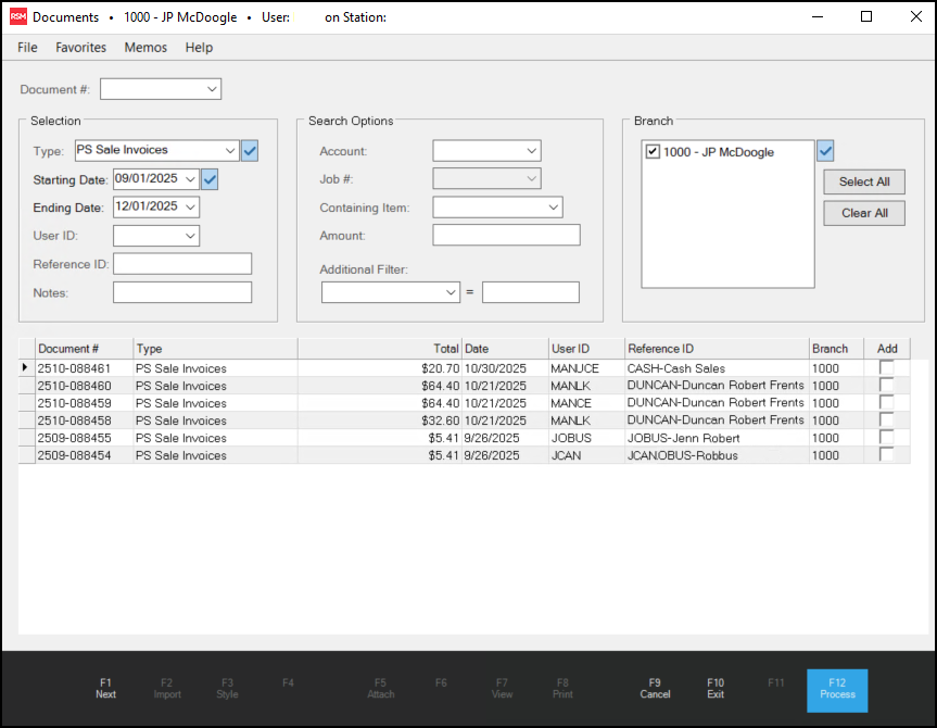 Once open, the Documents form used for listing, searching, and selecting documents for viewing (using the Document Viewer). All document types may be accessed using this same form (everything from Point of Sale invoices to customer statements). There are over 30 different types of documents and many documents have alternative styles that may be used for changing the print format of the document. Note: reports (such as financial statements, etc.) are not considered documents and cannot be accessed from this form.