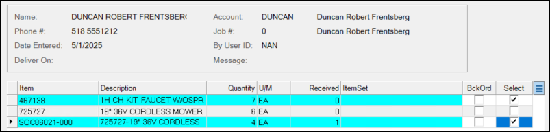 If some of the items need to be back ordered, in the Quantitty column, change the amount to the number you can provide based on your current on-hand stock. The application selects the BckOrd (Back Order) check box and the Select column to back order them.