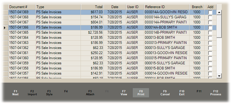 The Document form can be used to print, view, list, and locate any type of document maintained by the software. It's important to understand that not all types of documents can be faxed (or emailed). As a general rule, if the document can be faxed from another area (a Process form, for example), it can be faxed from documents also; however, if not, it probably can't. Faxing is accomplished by selecting the documents* you want to fax as rows in the grid and using the Print (F8) function which opens up a processing form.
