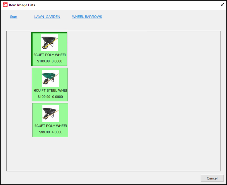 As you navigate through the layers of the Image List, navigation links are placed at the top of the form. When the list is used at Point of Sale, these links are shown with a blue text-color and are underlined similar to a hyperlink in a document or web page. Clicking on the links navigates the user to that level. In the Maintenance form, the links are not colored or underlined, but also work the same way. In addition, the links in the maintenance form also save any changes.