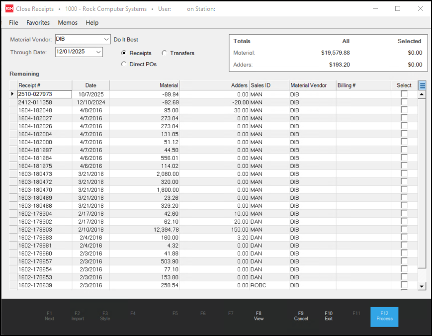 8. Select Process (F12) to mark the selected receipt documents from the grid as closed.