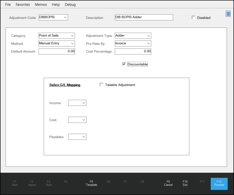 2. Complete the entries for this adjustment code as shown below and enter the default amount or cost percentage that is charged by DIB.