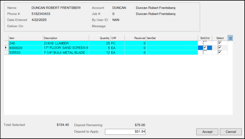 The Deposit to Apply amount is calculated based upon the selections in the data grid. The total is calculated for each selected item using the item's quantity, price, and taxable status. Click here to learn more about the Deposit to Apply field entry.