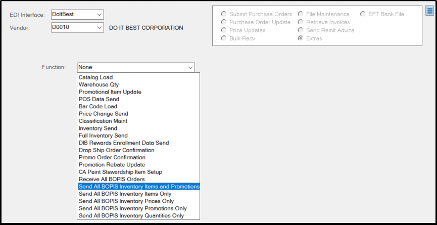 After you complete the initial inventory send and have received confirmation from Do It Best, more BOPIS send options display in the Function list.