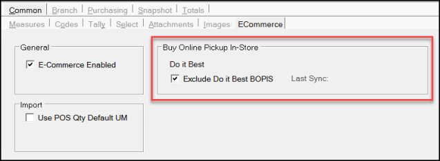 If an Inventory item does not meet all of the above criteria, it will not be eligible for upload to Do It Best for inclusion in the BOPIS program. You can exclude items from the BOPIS program by selecting the Exclude Do It Best BOPIS check box in the inventory item's Common > ECommerce tab. (Inventory > Database > Item form.) Using the Item Global Modify Utility, you can also set this exclusion option for many items at a time. (Choose the Cmn - DIB BOPIS Exclude option in the Field Name list.)
