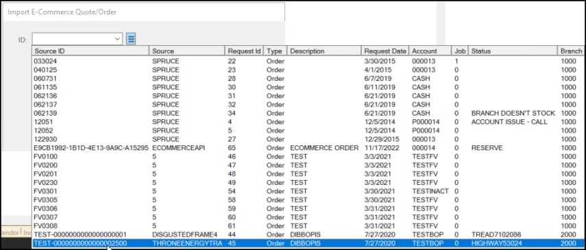 5. Choose E-Commerce from the list. The Import E-Commerce Quote/Order box displays.