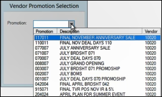 3. Click the Ordering (F5) key and choose the Vendor Promotion option from the context list. The Vendor Promotion Selection list displays.
