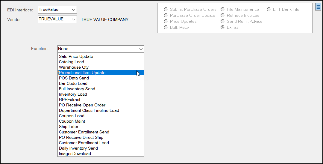 2. From the EDI Interface list, choose the True Value interface, and from the Vendor list, choose the vendor ID.