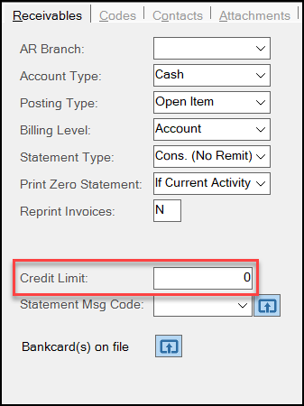 Account Maintenance > Receivables Tab > Credit Limit Field