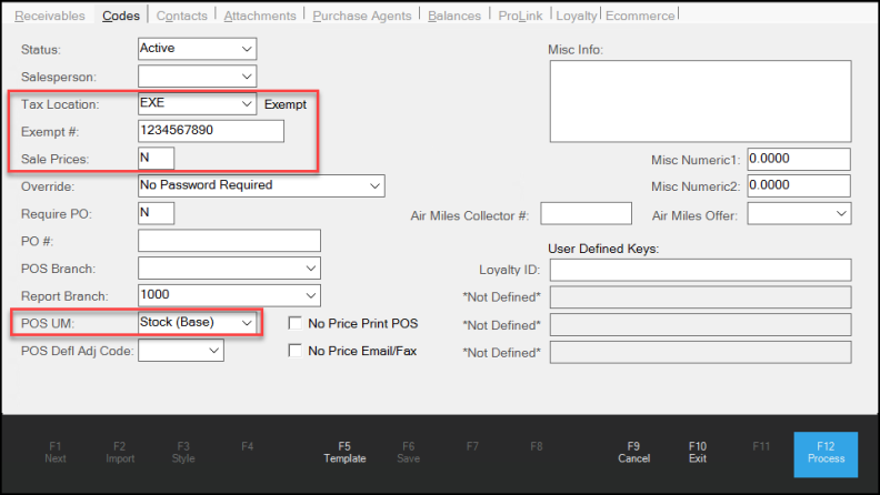 When you set up the DIB BOPIS branch, you add a standard receivables account that the application can use to collect the DIB BOPIS records that are submitted for your store. Use the instructions below to establish this account. The charge account must be tax-exempt and must disable sales prices as we describe below. You can use this account record to bring up any BOPIS orders that show up for your store. It is not necessary to set a credit limit for the account. If you accept DIB BOPIS orders at more than one store, you should set up DIB BOPIS accounts at each branch location for tracking and accounting purposes.