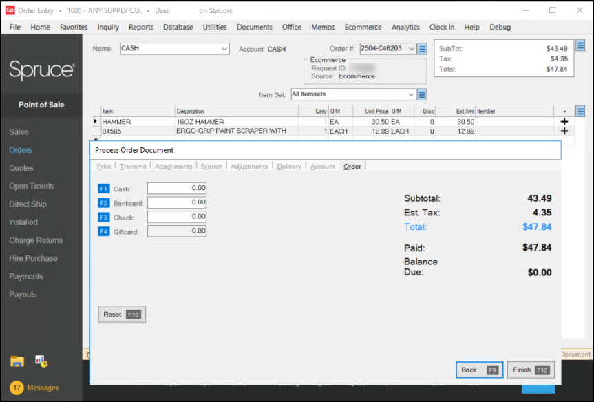 8. Check to make sure the customer has the items listed on the data grid and then choose Process (F12) to complete the transaction. Since the customer paid online, the Process Order Document does not require a payment at the time of the customer pick up. You complete the transaction to add a record with the inventory and cost information.