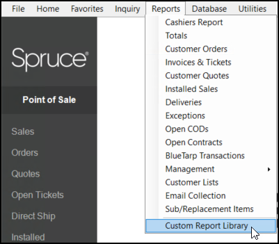 To access the custom reports for a particular application area, from the Main Menu, choose the application area that contains the report you want (Point of Sale, Purchasing, Inventory, etc.) and click the Reports option from the toolbar. At the bottom of each Reports list is the Custom Report Library.