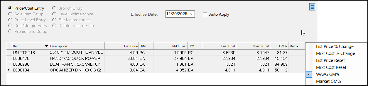 Use this option to change the List Price and Market Cost for the items entered in the data grid. The grid displays other costs and the item's matrix code (if used) for reference only.